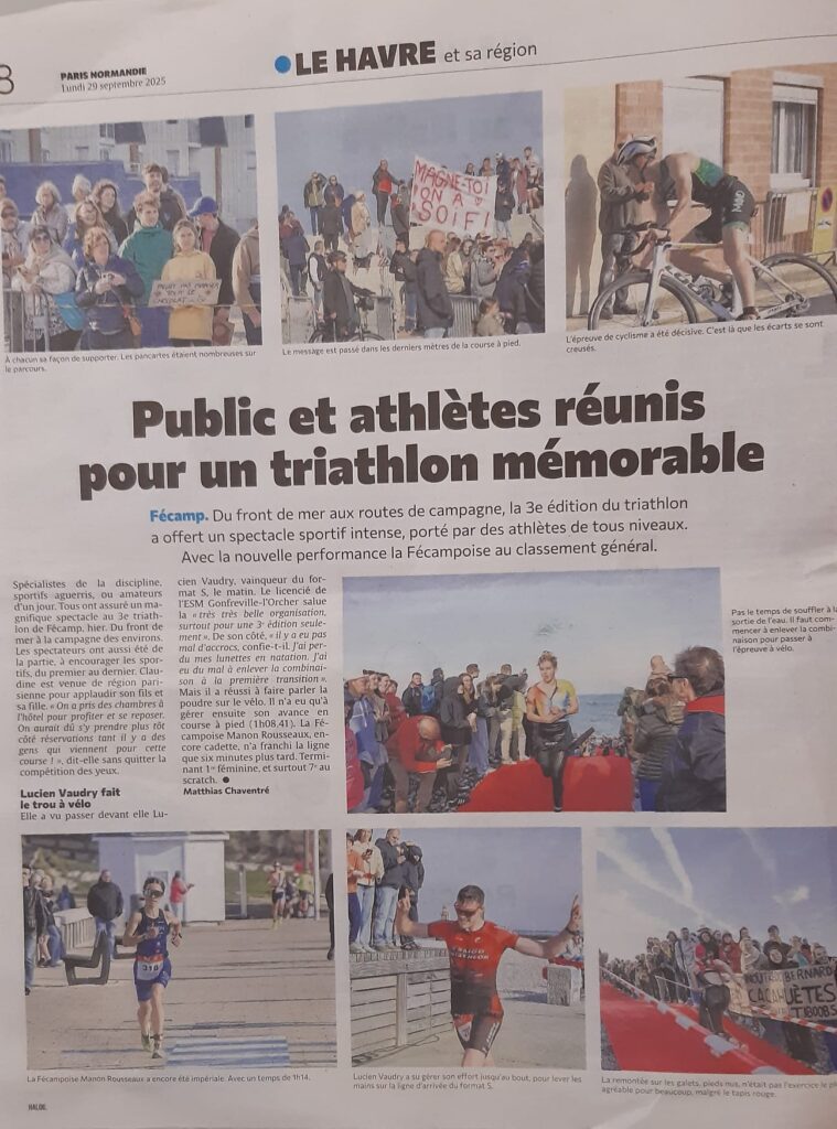 Encore une belle réussite pour ce triathlon de Fécamp, 3e édition seulement et un succès grandissant. Une ambiance de dingue, un public au rendez-vous, des triathlètes au top, une météo parfaite, des bénévoles au taquet.