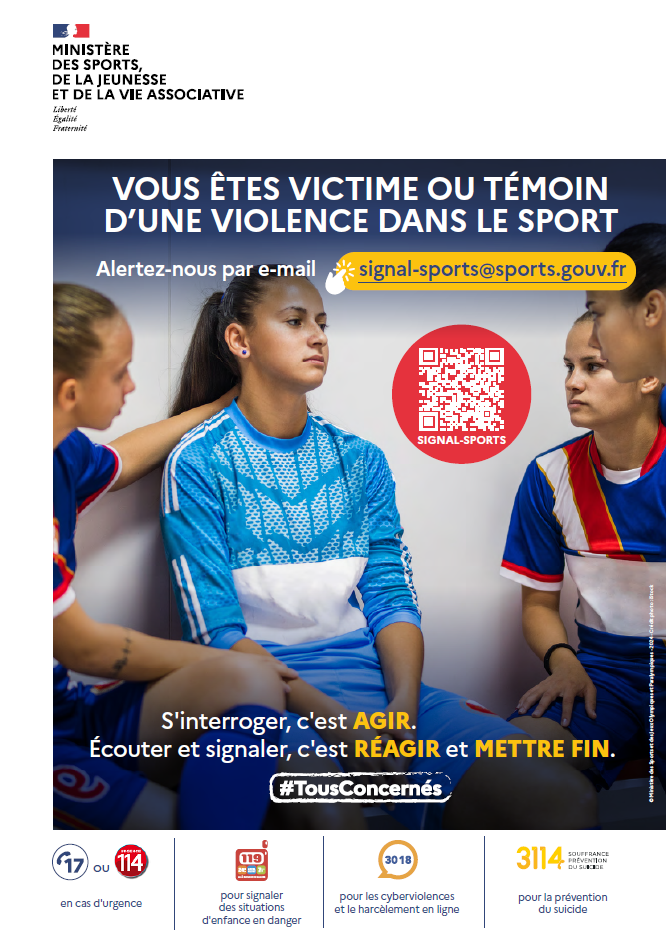 ⚠️ D’ici le 16 novembre 2025, tous les établissements dans lesquels sont pratiquées des activités sportives doivent afficher les coordonnées de la cellule de traitement de signalement des violences dans le sport, ainsi que les contacts pour accompagner les victimes et les témoins.